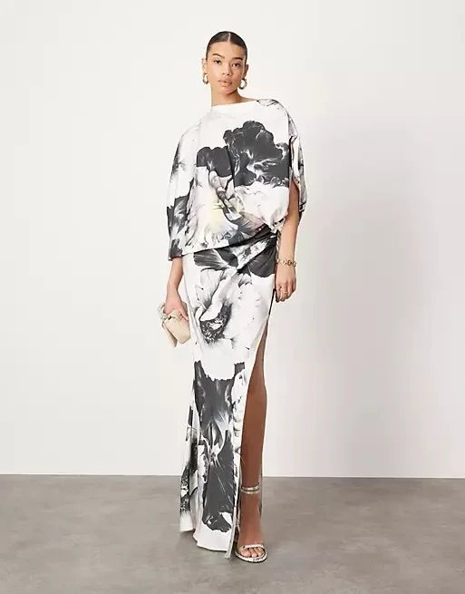 This is the perfect dress for a summer wedding! The unique cut of the top and bold flower print is so beautiful. This would look amazing with a bright lip and some matching shoes.